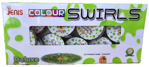Unleash fun with **Green Color Chakkar Jenis Crackers COLOUR SWIRLS (JUMPING)** from Crackers Corner! These unique chakkars not only create mesmerizing **green color swirls** but also add an element of surprise with their **subtle jumping action**. Each box contains **10 pieces**, perfect for adding a playful twist to your celebrations. Recommended for ages **14+**.