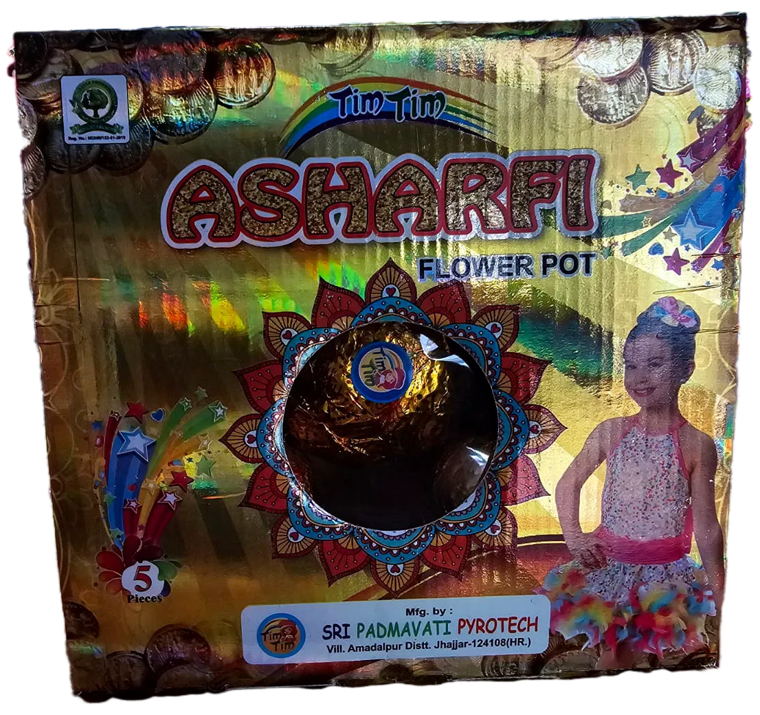 Light up your night with Tim Tim Asharf Flower Pot Crackers! This 5-piece 'Laddu' shaped box delivers a brilliant golden shower effect, perfect for any celebration. Ideal for ages 14+. Grab yours at Crackers Corner!