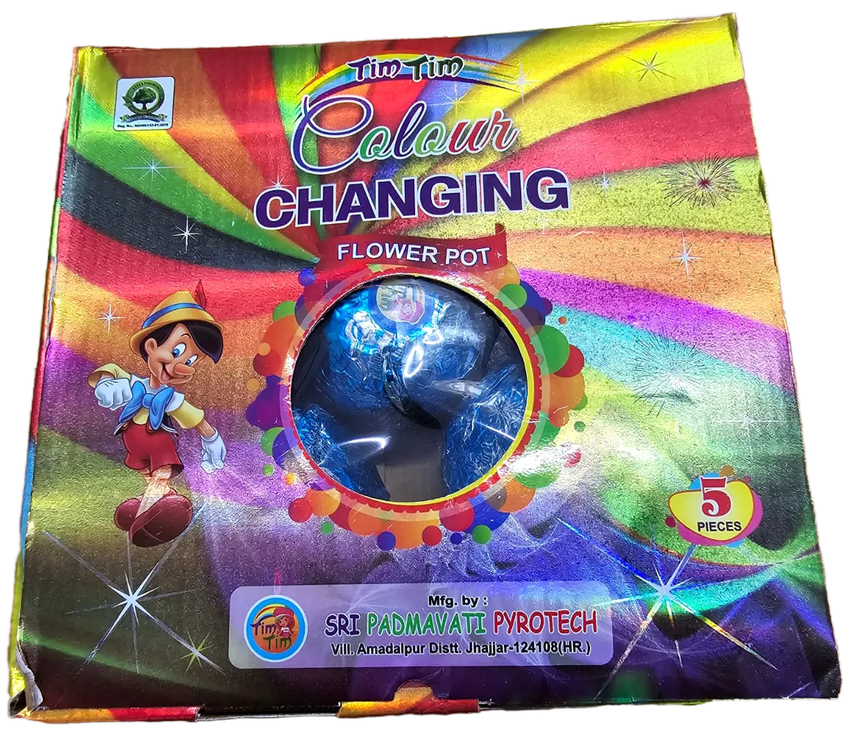 Experience the magic of Tim Tim Color Changing Flower Pot Crackers! This 5-piece 'Laddu' shaped box delivers a dynamic color-changing shower effect, perfect for night time. Ideal for ages 14+. Grab yours at Crackers Corner!