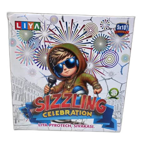 5X10 Sizzling Celebration Crackers — 50 vibrant multi-color aerial shots in 5 sequences for spectacular finales. 1-piece, 14+ age.